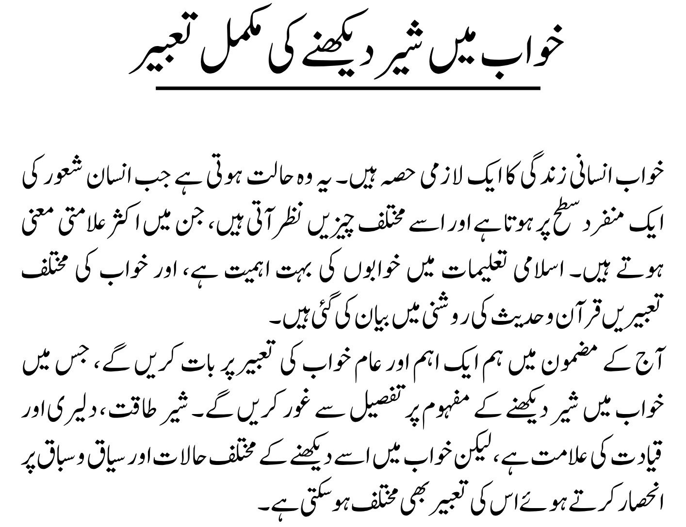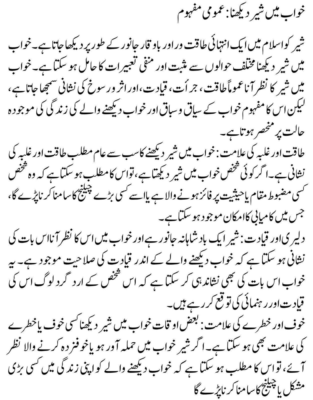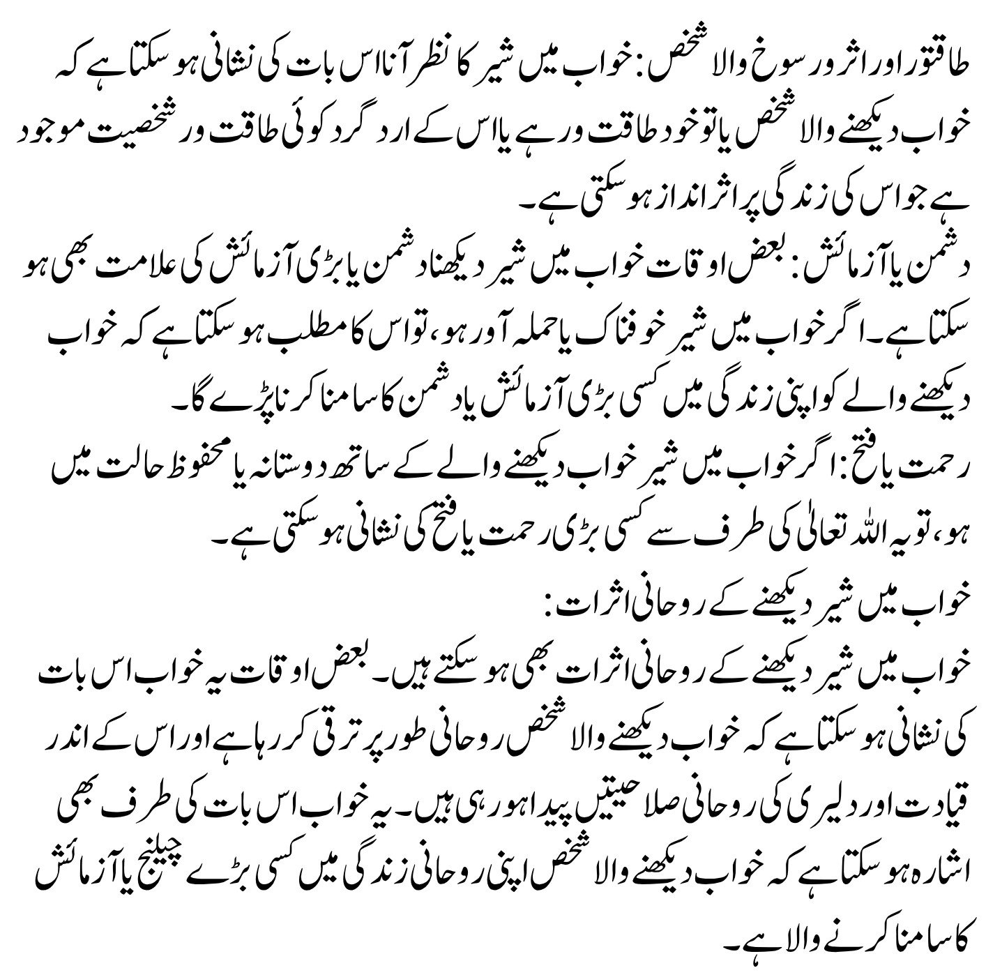 Seeing a lion in a dream is a significant and symbolic experience in Islamic dream interpretation. Its meaning can differ based on personal circumstances, the dream’s context, and timing. Accurate interpretations require expertise in ‘Tabeer-ur-Roya.’