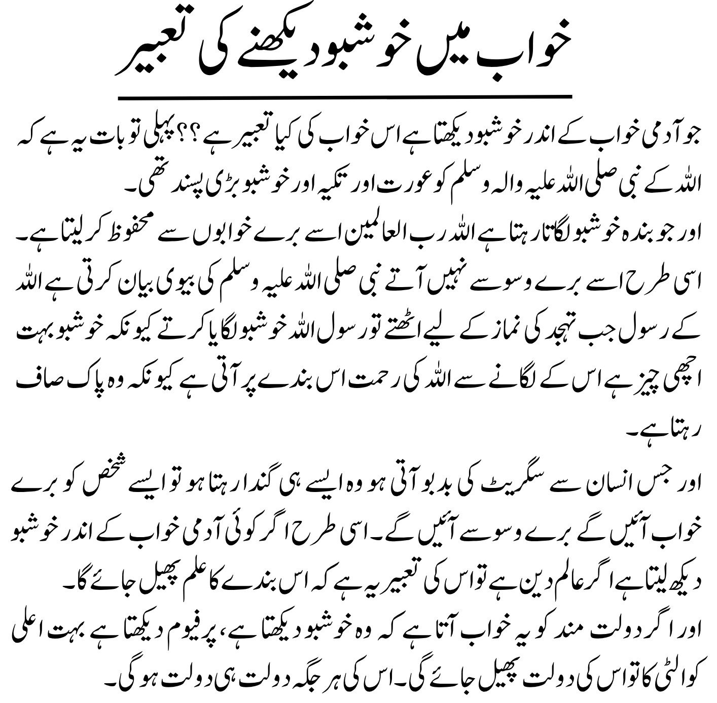 In Islam, dreaming of fragrance or perfume carries positive and spiritually uplifting meanings. The dream may reflect purity, good character, spiritual blessings, and increased respect in society. This dream can also vary in meaning depending onw hether the person is a scholar, a wealthy individual, or a common man.